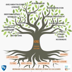 Op dit moment bevindt het onderzoek zich in fase 4: de inzichten die zijn opgedaan worden in praktijk gebracht en het onderzoek wordt voortgezet en uitgebreid naar andere scholen, waaronder een middelbare school. Deze inzichten zijn gepresenteerd in onderstaande boom (afbeelding 1): de boom staat symbool voor groei, omdat een hbo-pedagoog op scholen iets nieuws is en de functie/rol/plek op school zeker nog zal veranderen en groeien. De kern is dat er meer tijd en ruimte is voor de kinderen om hen te helpen in hun ontwikkeling (gesprekken en begeleiding) – zie stam van de boom. In de takken en bladeren van de boom is weergegeven welke taken de hbo-pedagoog in een basisschool op zich kan nemen. Om dat allemaal goed te kunnen doen, zijn er verschillende voorwaarden: die zijn in de wortels (de basis) weergegeven.