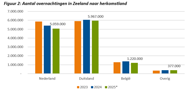 In 2025 kwamen ruim 3 miljoen toeristen naar Zeeland voor een vakantie of zakelijk verblijf, een daling van 3% ten opzichte van 2024. Dit is, met uitzondering van het coronajaar 2020, de eerste daling in het aantal gasten sinds de start van de trendreeks in 2012. In totaal verbleven gasten 12,6 miljoen nachten in de provincie in 2025, een daling van 5%, na een daling van 1% een jaar eerder.