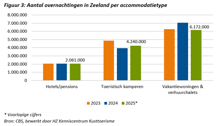 Het aantal overnachtingen op Zeeuwse huisjesterreinen is in 2025 met 12% gedaald. Daarmee ligt het niveau lager dan in 2023. In Zeeuwse hotels bleef het aantal overnachtingen in 2025 stabiel ten opzichte van voorgaande jaren. Campings in Zeeland noteerden een stijging van 7% in 2025. Deze groei was echter niet voldoende om de sterke daling van een jaar eerder volledig goed te maken.